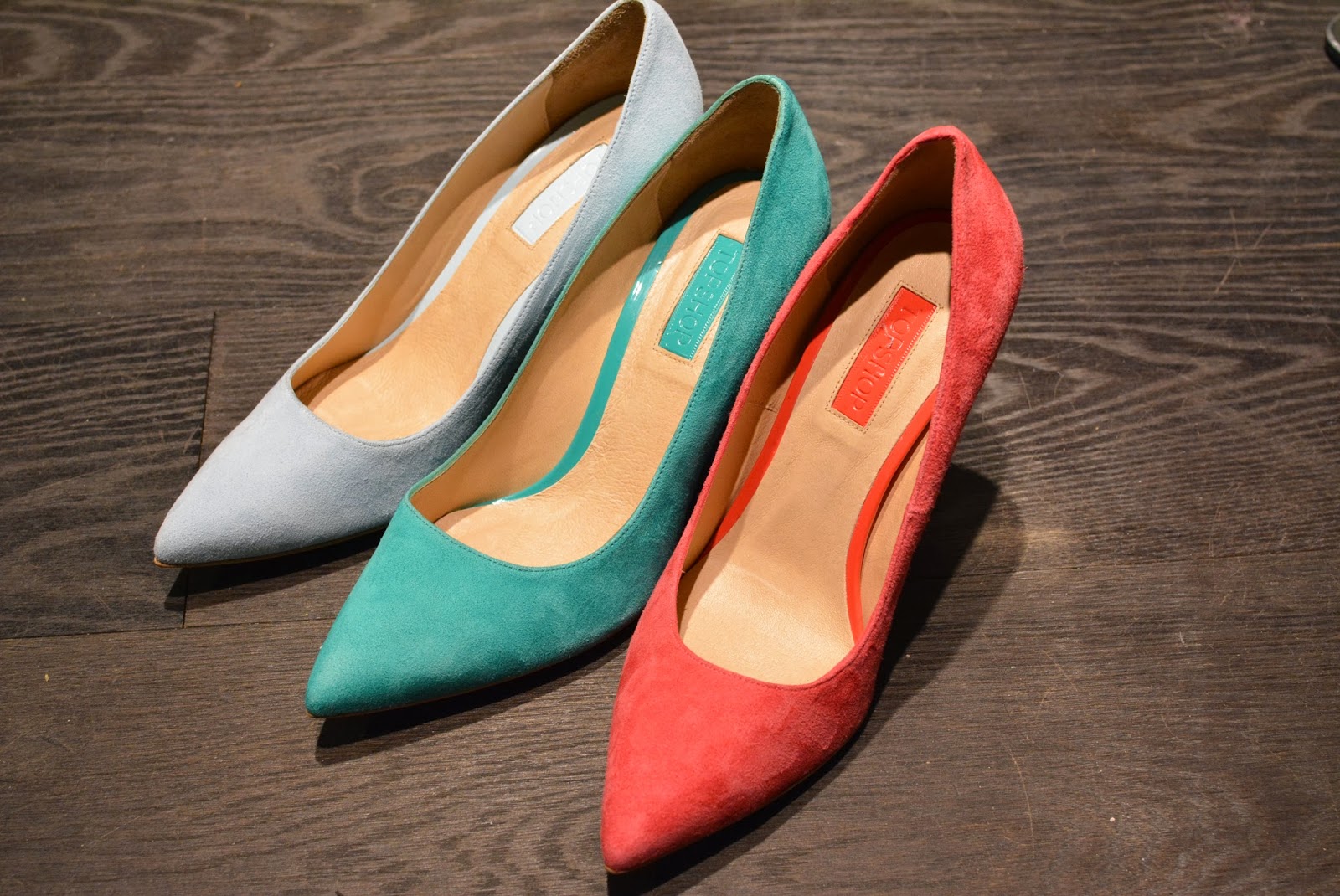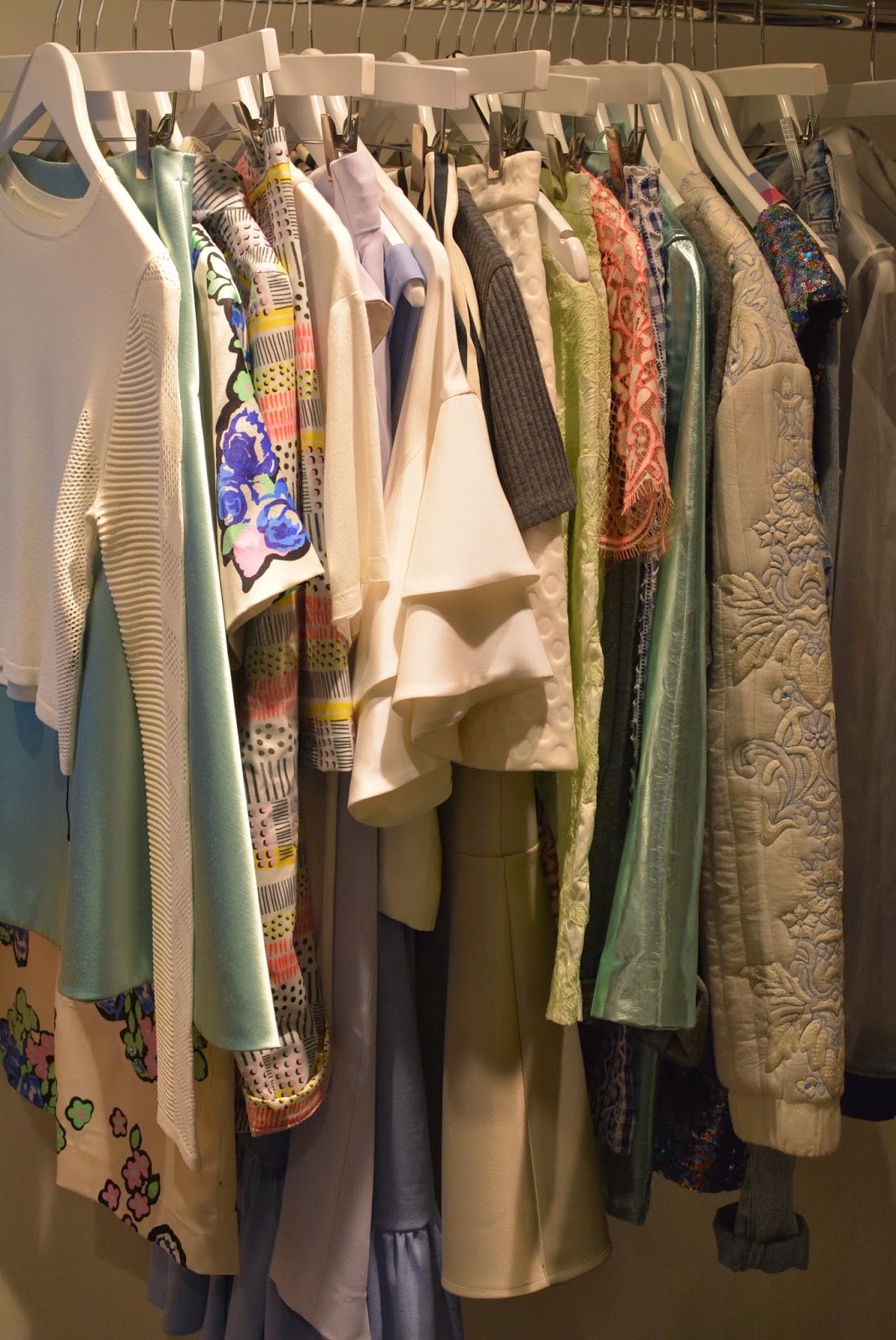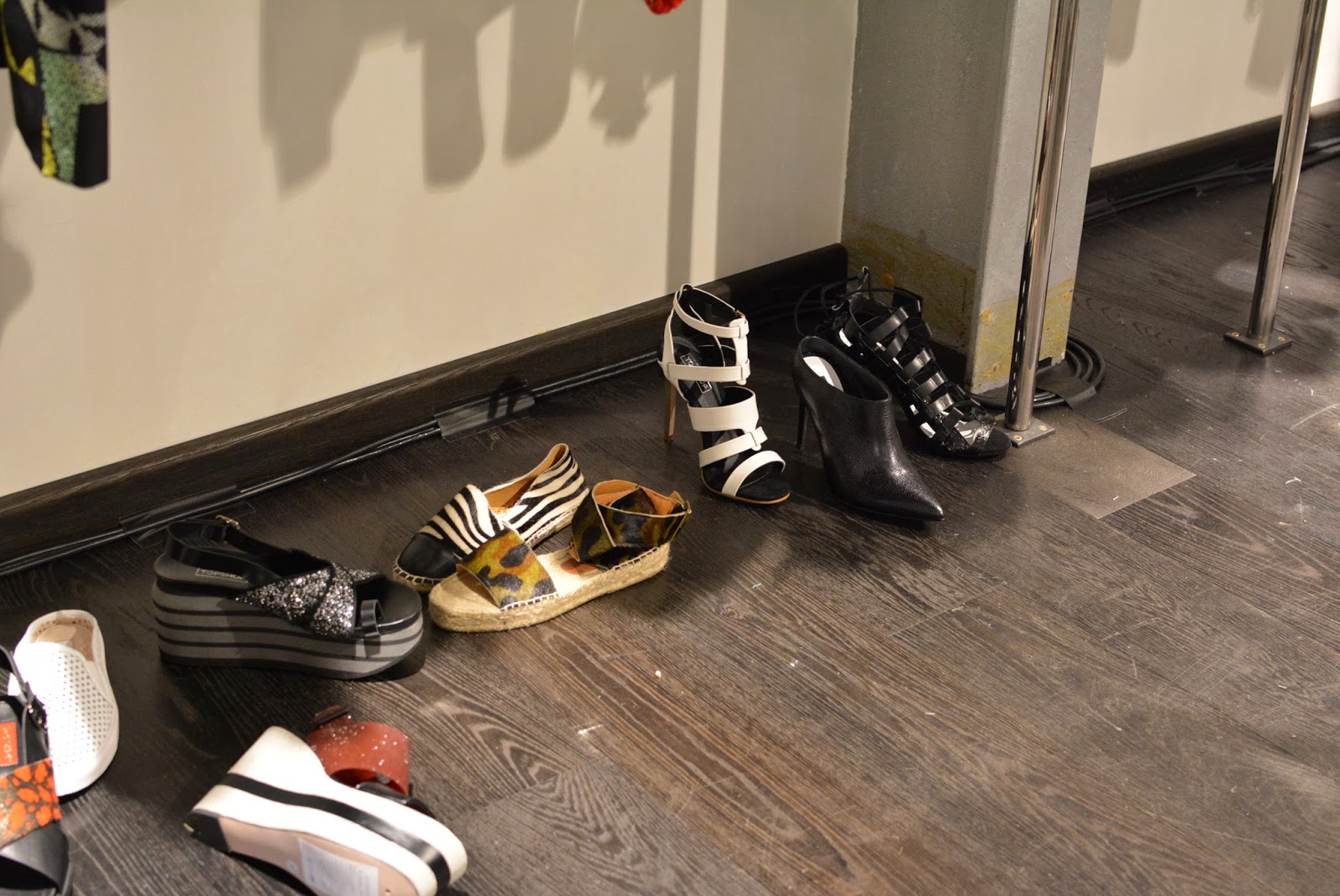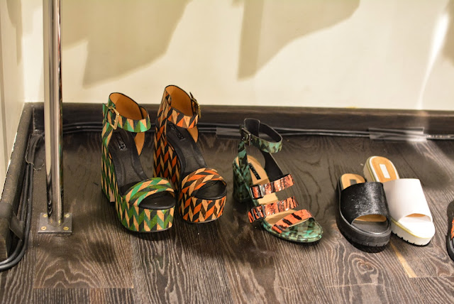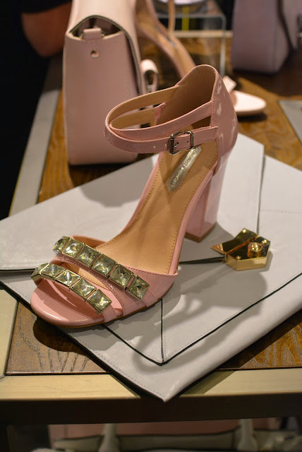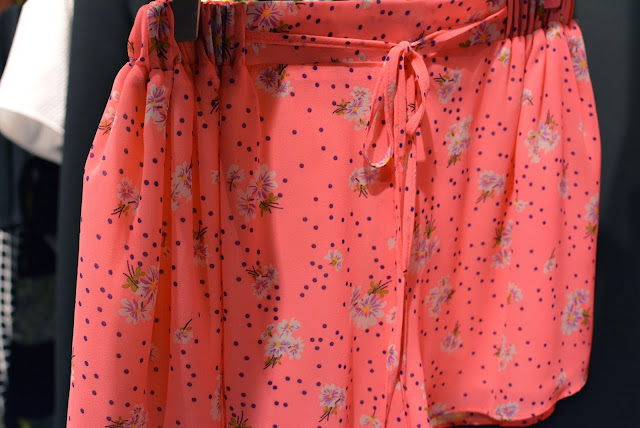 At Topshop I saw plenty of tribal inspired jewellery with some primary colours thrown in for good measure. You can never go wrong with Freedom jewellery, statement necklaces a-plenty here! I spotted some new colours of the famed ‘Gwenda’ suede court shoes, which have to be my favourite shoe of all time, although each season they change the name, the shape remains the same, and for a high street shoe, they are so comfortable. All three new colours are for sure on my ‘I want it or i’ll just die’ list! The Celine-esque pony slides wouldn’t normally have been my style, but as I, ummmm…’mature’ I’m finding that my taste is evolving and I’m falling for styles like that, with simple clean lines, very chic and minimal. I think for brave London fashionistas those will go down very well. On the rails I noticed lots of tropical prints and some very ethnic inspired pieces which will be sure fire hits come festival season, this was also reflected in the accessories with boho style duffle bags. As a contrast to that on the second rail (which was more ‘me’) there were some simple elegant styles including a raw edge pink trench style coat (Yes…another pink coat) which was made from the most fascinating of fabrics, I felt like it could be a neoprene backed crepe, but I can’t be sure, either way it was a beaut! There was a touch of this season’s pvc and some pastel coloured leather, but what I zoomed in on was the watercolour floral prints in matching sets (Hinting towards Acne inspo), uh-maaaaaaaazeballs!
