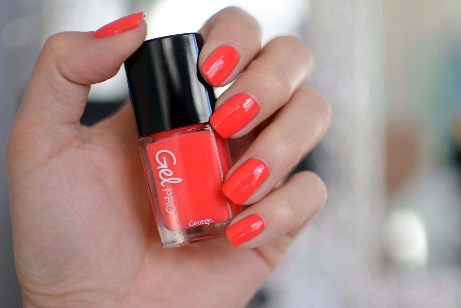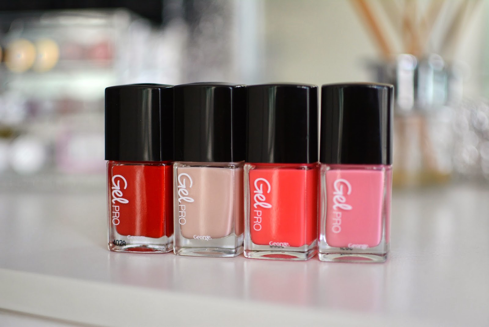 So it seems that every cosmetics brand under the sun have created a Gel collection and I’m more than happy to keep testing them all 🙂 I’ve tried out this Gel Pro range from George at Asda which retail at £3 per bottle. I’ve swatched 4 colours here (the ones I thought most appropriate for this season) however there are 15 colours (including a clear top coat) to choose from. Price-wise £3 is pretty darn good, but does that mean a compromise on quality? Not really in this case. There are a few bug bears I have with some of the colours and I wish that there had been some more ‘Spring/ Summer Trend’ colours added into the collection (i.e. a lilac, a grey, a white) but all round it’s a good polish.
