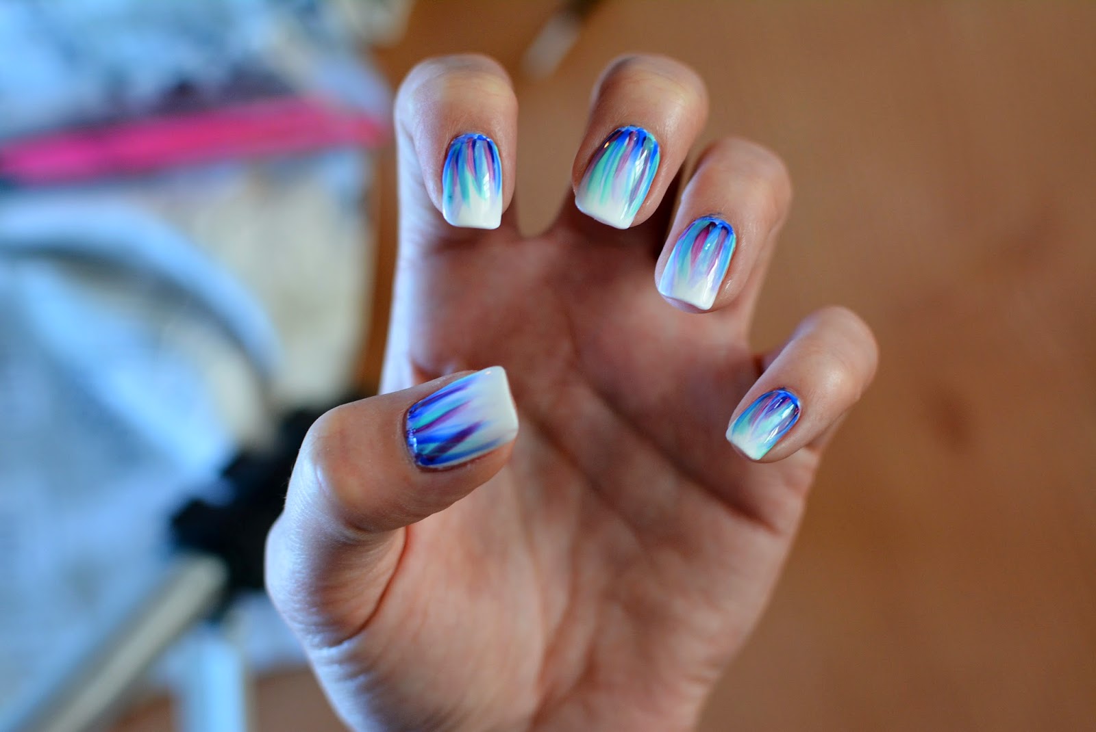 3. Dab a couple of drops of your first colour (I normally do the darkest colour first) onto your makeshift pallet and lightly coat your nail art brush in the polish, wipe off any big ‘blobs’ as this will not make a nice brushstroke. Starting at the cuticle swipe your brush up the nail. I have done about 3-4 strokes on each nail depending on the size (you can fit much on a pinky!). Repeat this step for each nail and the clean your nail art brush before going to on to the next colour.