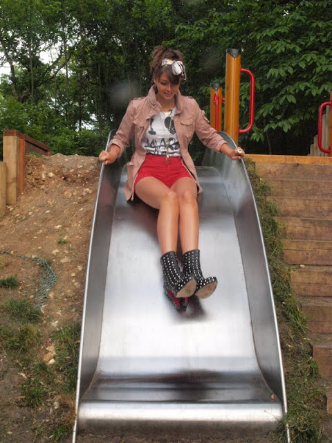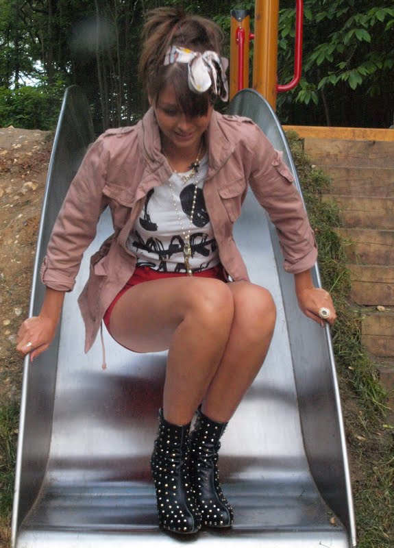 Jacket: H&M. Shorts: New Look. T-Shirt: River Island. Boots: Christian Louboutin. Head Scarf: New Look. Big Ring: Juicy Couture. Love Ring: Accessorize. Love Necklace: New Look. Watch Necklace: New Look.