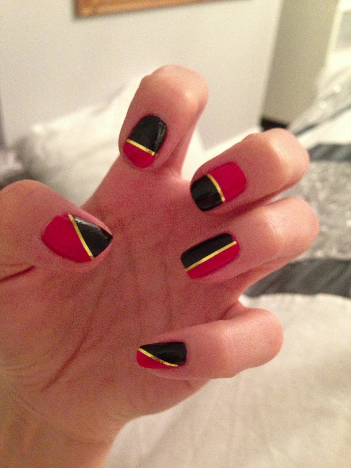 Today’s nails have been created using Models Own ‘Raspberry Crush and 2True (which you can buy at Superdrug) shade 39 (Black). Simply paint your nails in the lightest of your 2 chosen colours, once they’re dry, using the darker colour paint on your chosen contrasting areas. Once this is dry use nail tape, I have used metallic gold, to go over the join, they instantly look neater and it’s a pretty cool effect. Time wise this probably only takes half an hour, so why not have a crack whilst watching Eastenders eh.